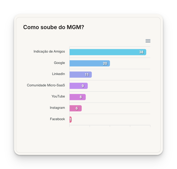 A margem do MGM líquida é um pouco mais de 90%, pois o custo de infra é bem baixo. Se somar todos os meus custos, deve ser menos de R$ 1 mil por mês. Ou seja, é um belo exemplo de um Micro-SaaS, enxuto, rentável e nichado.