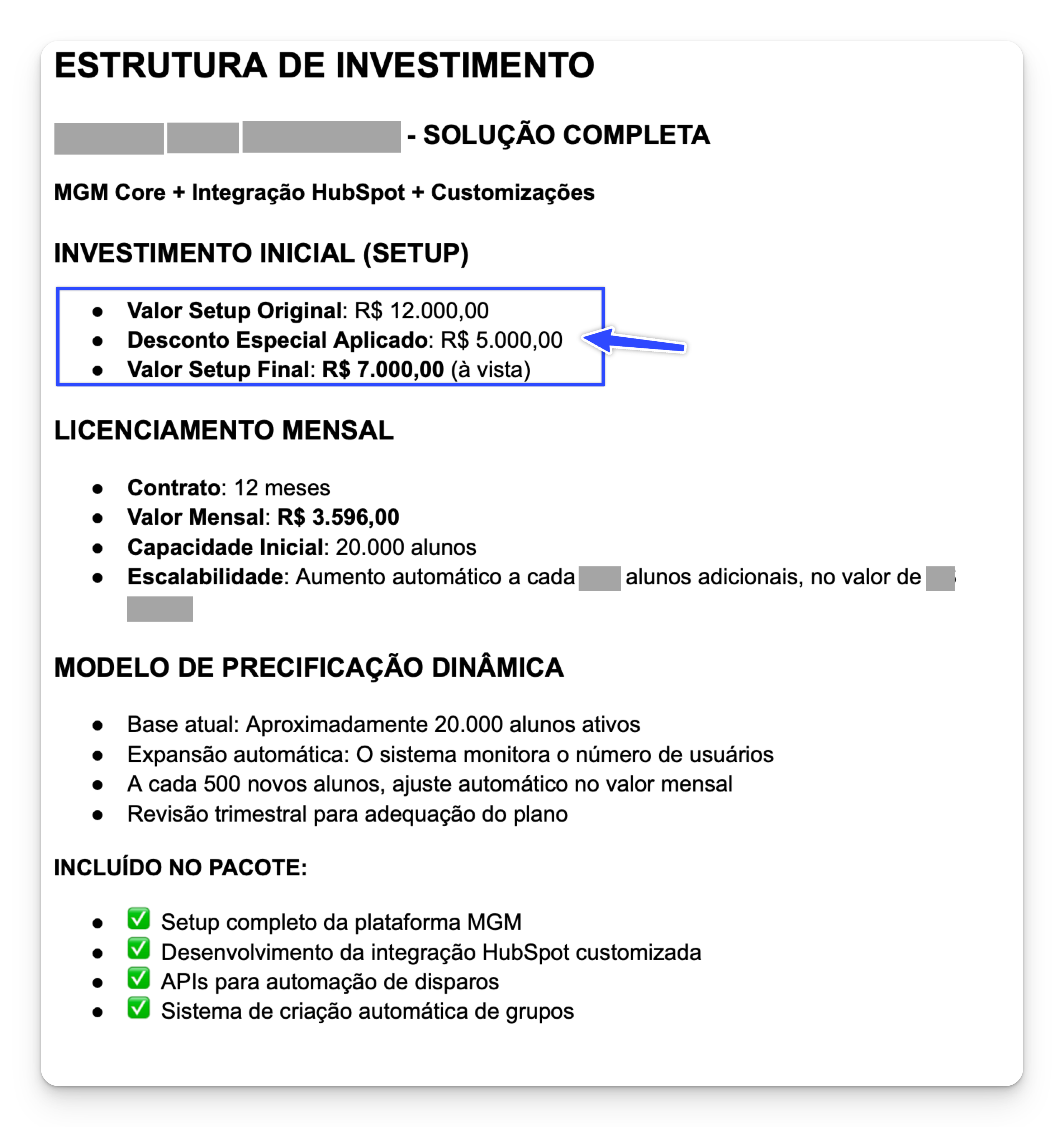 Por exemplo, atendemos muitas faculdades. Uma delas pediu para criar uma integração específica com o Hubspot. Topamos fazer, e o valor inicial da customização era de R$ 12 mil. Mas, acabamos fechando por R$ 7 mil, com a condição de o cliente fechar um contrato de 12 meses. E, sinceramente, essa negociação funciona na grande maioria das vezes. Até porque as grandes empresas querem construir relação com fornecedores de longo prazo.