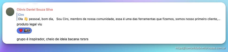 Na internet, além de Micro-SaaS, existem vários desenvolvedores que estão construindo ferramentas e produtos focados em construção de audiência - como no caso do @Titxo, da comunidade do Telegram.