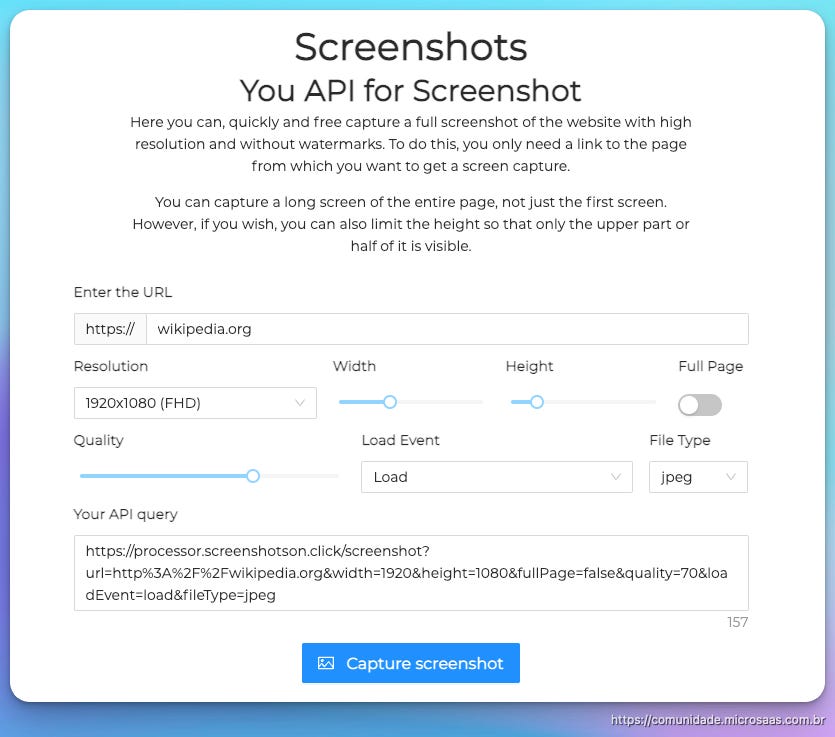 Aqui você pode, de forma rápida e gratuita, capturar a tela completa do site com alta resolução e sem marcas d'água. Para fazer isso, você só precisa de um link para a página da qual deseja obter uma captura de tela.