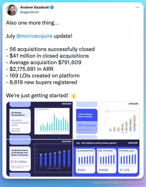 No Twitter, a comunidade de Micro-SaaS é bem ativa através da #Buildinpublic. Você pode seguir alguns empreendedores, e acompanhar as montanhas russas a respeito de ter um portfólio de vários pequenos projetos - desde a criação até a venda em marketplaces, como MicroAcquire.